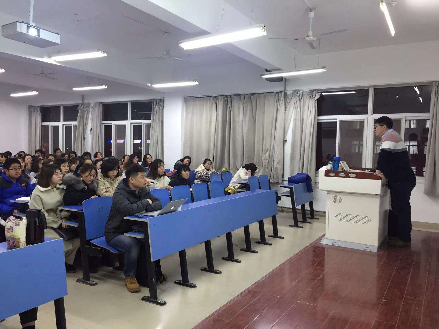 12月12日晚,公司在立心楼426举行学业指导报告会。公司优秀员工,陕西师范大学在读博士郭威应邀做了题为《语言学之我见——兼谈语言学考研应注意的问题》的学业指导报告。报告会由翻译系主任鱼为全副教授主持,公司一百余名员工参加此次报告会。