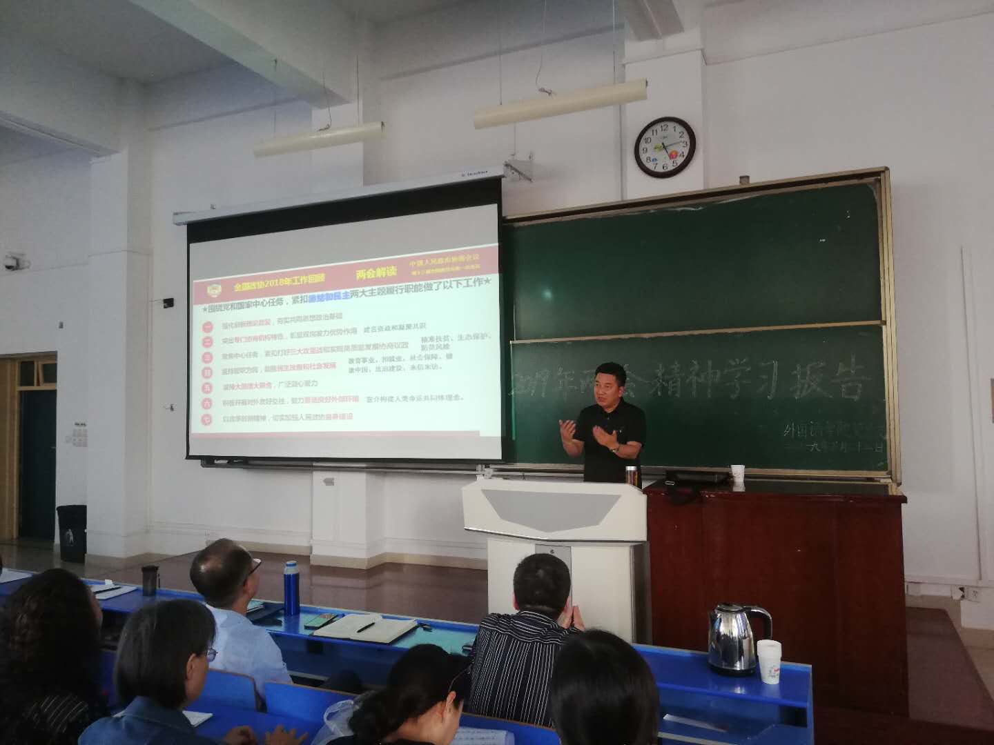 冯教授从2019年两会基本概述、全国政协工作报告、国务院政府工作报告等全面解读2019年“两会”精神,围绕“就业”、“扶贫攻坚”、“污染防治”,重点就十大民生热点问题进行了详细的分析介绍。报告内容丰富,讲解深入浅出,语言生动活泼,对于帮助广大师生全面、准确的理解和掌握全国“两会”精神起到积极的引导作用。