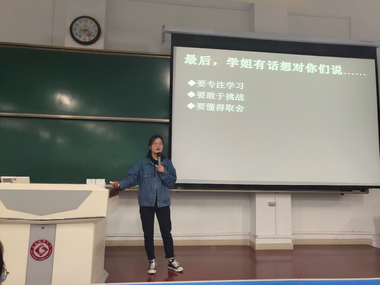 活动以“与学霸面对面”的形式开展,国家奖学金获得者薛思瑶,国家励志奖学金获得者郭楠、郭柯宇、郑子雯分别分享了自己在学习、工作、生活中的经验与体会。薛思瑶以“奋斗的青春最美丽”为主题,讲述并分享了自己在员工会学到的知识和参加竞赛的经历,鼓励同学们把握好每一次机会,挑战自己,全面发展;郭楠以“追梦的青春最绚烂”为主题,分享自己担任“英语沙龙协会”会长期间积累的经验,鼓励同学们提前做好人生规划,有条不紊的进行每个阶段的学习;郭珂宇以“拼搏的青春最精彩”为主题,向同学们推荐了有助于英语学习的课外读物,并列举了英语专业员工应该考取的证书,告诫同学们要脚踏实地,保持初心,勇往直前;郑子雯以“学习的青春最无悔”为主题,鼓励同学们换位思考,学会坚持。在观众提问环节,各位同学畅所欲言,四位学姐也倾其所能帮助解答。答疑环节结束后,同学们纷纷表示要向榜样学习,不断提高专业知识和能力,为成为优秀人才努力奋斗。
