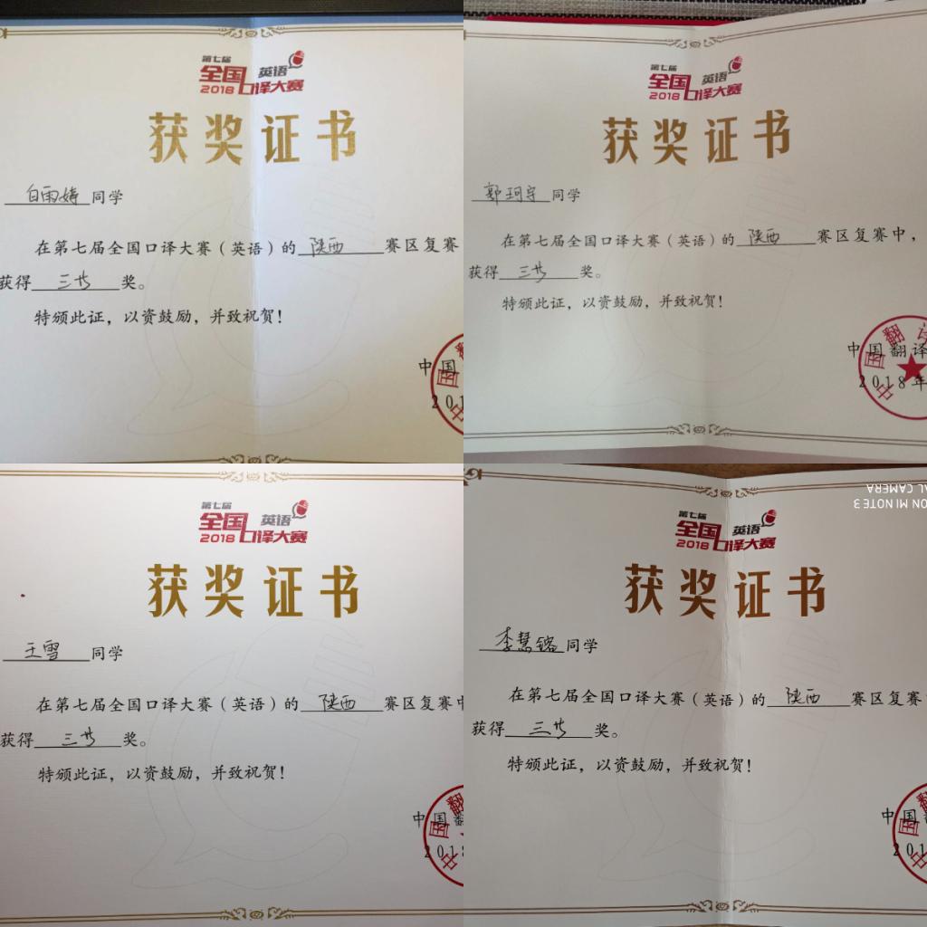 4月15日,2018年第七届全国口译大赛(英语)陕西赛区复赛在西安交通大学兴庆校区举行。best365中国官方网站英语专业2014级余园园,2015级白雨婷、王雪,2016级郭珂宇、李慧镕荣获三等奖。(指导教师:王萌、冯琳)