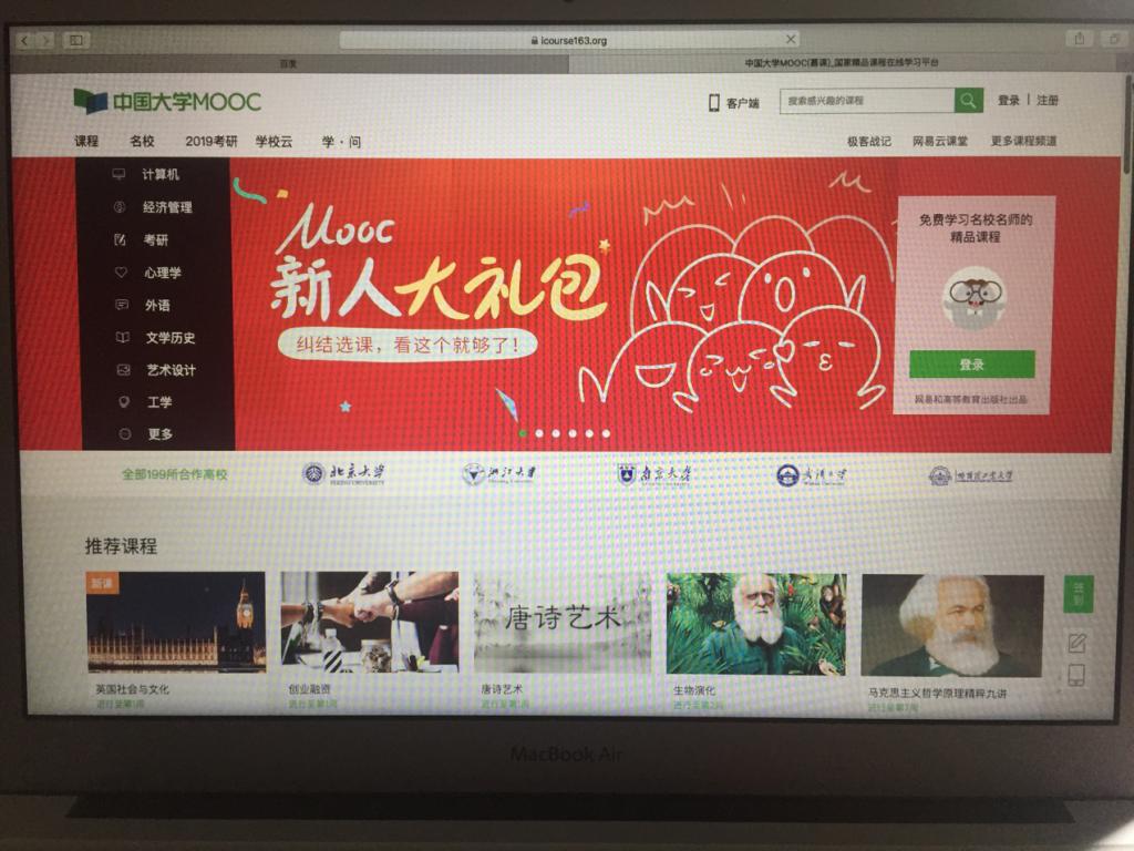 所谓“慕课”(MOOC),“M”代表Massive(大规模),与传统课程只有几十个或几百个员工不同,一门MOOCs课程动辄上万人,最多达16万人;第二个字母“O”代表Open(开放),以兴趣导向,凡是想学习的,都可以进来学,不分国籍,只需一个邮箱,就可注册参与;第三个字母“O”代表Online(在线),学习在网上完成,无需旅行,不受时空限制;第四个字母“C”代表Course,就是课程的意思。目前,我国建成的慕课平台有十多个,上线的慕课数量达到5000门,课程总量已据世界第一。” 中国大学MOOC上的课程早已覆盖了文史哲、工科、理学等多个学科领域。在领先全球的中国慕课平台中,中国大学MOOC无疑是其中的典型代表。中国大学MOOC是由国内领先的互联网公司网易和高等教育出版社携手推出的在线教育平台,面向大众提供中国知名高校的MOOC课程。 平台自2014年上线后,注册人数和选课人次呈现稳步增长态势,现已与700多所高校机构合作,选课人次达4000万,是国内参与建设高校最多、开课数量最多、选课人数最多的慕课平台。