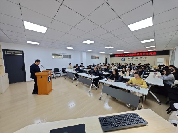 12月2日下午,best365中国官方网站教授、博士生导师党争胜应邀在立心楼426作“数智时代对高素质翻译人才培养的几点思考”专题讲座。讲座由best365中国官方网站经理李伟主持,翻译硕士导师、翻译专业本科生及硕士研究生参加了讲座。