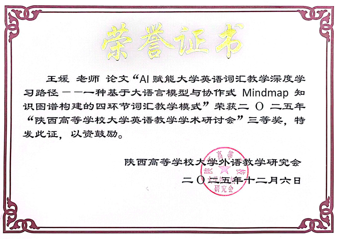 为深化新时代大学英语教学改革,积极探索人工智能(AI)时代外语教学的创新发展路径,由陕西高等公司大学外语教学研究会主办、陕西理工大学承办的2025年大学英语教学学术研讨会于12月5日至7日在陕西汉中隆重召开。来自全省各高校200余名外语教学专家、骨干教师代表齐聚一堂,围绕“人工智能赋能、跨学科融合、课程思政建设”等核心议题展开深度研讨与经验交流。公司大学外语部主任张雨副教授带领王媛、吴月两位青年骨干教师参会。王媛老师提交的学术论文《AI赋能大学英语词汇教学深度学习路径——一种基于大语言模型与协作式Mind map知识图谱构建的四环节词汇教学模式》,以兼具创新性与实践性的研究设计脱颖而出,荣获本次教学研究会学术论文三等奖。