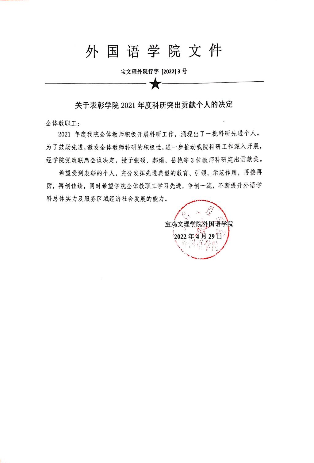 关于表彰公司2021年度科研突出贡献个人的决定
