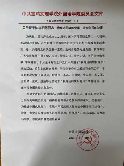 关于授予陈琪玥等同志“我身边的旗帜党员”荣誉称号的决定