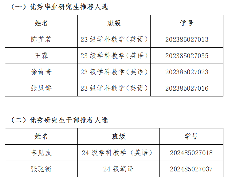 根据研究生工作部党委《关于做好2025届优秀毕业研究生及优秀研究生干部评选工作的通知》和《best365中国官网研究生综合奖励办法(试行)》的相关要求,best365中国官方网站于近期进行了2025届“优秀毕业研究生”及“优秀研究生干部”候选人选的组织推荐和评审工作,经资格审查及综合评审,拟评选产生“优秀毕业研究生”推荐人选4人、“优秀研究生干部”推荐人选2名,现将拟推荐人选予以公示。