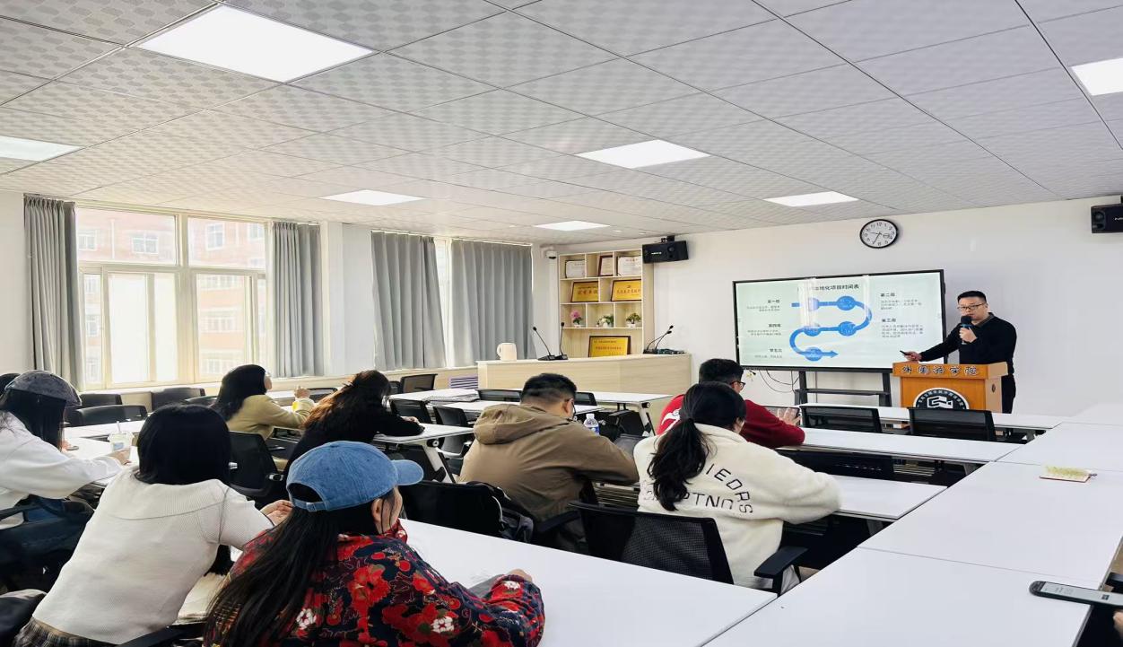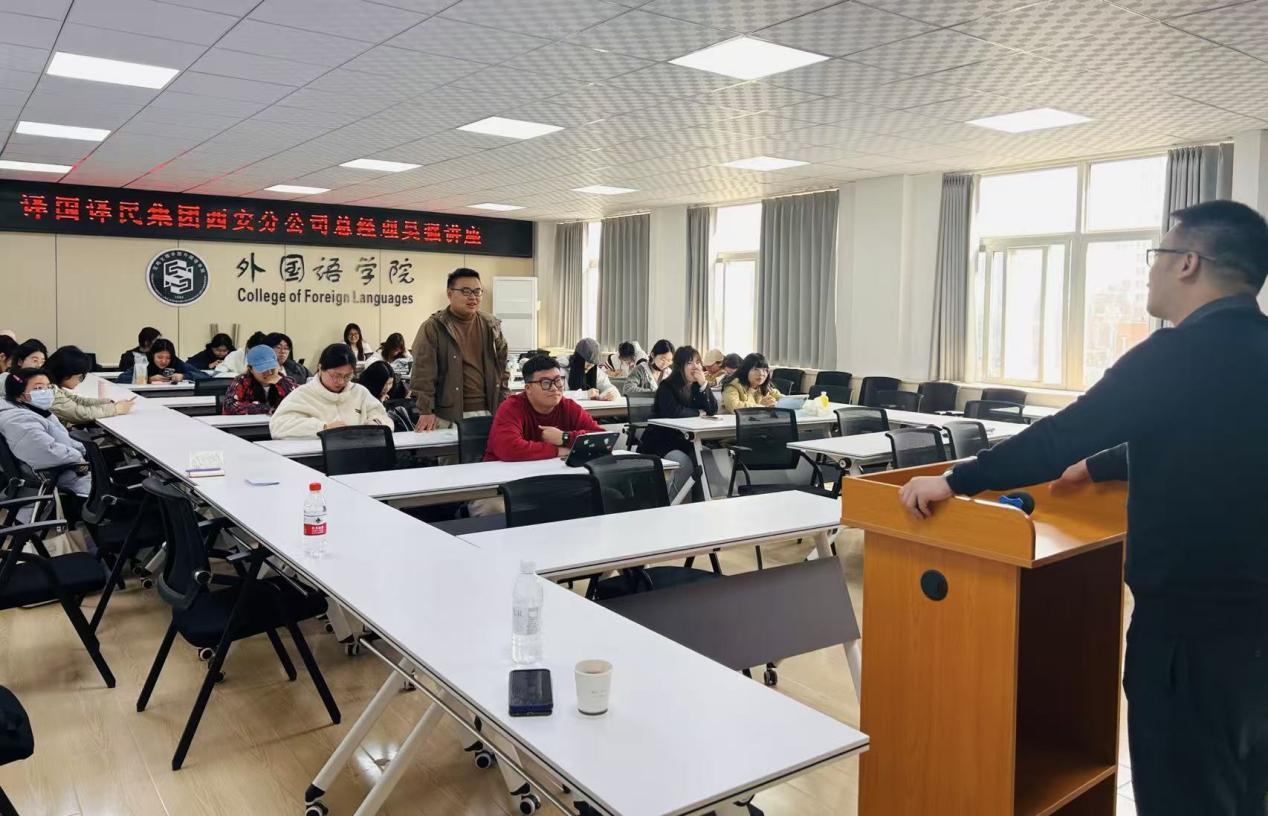 3月11日下午,译国译民集团西安公司总经理吴强应邀在立心楼426教室为公司师生作了题为《AI时代下翻译行业的突围与转型》的专题讲座。讲座由公司团队建设与研究生教育发展中心副主任张笑主持,公司翻译本科生、翻译硕士及部分教师到场聆听。